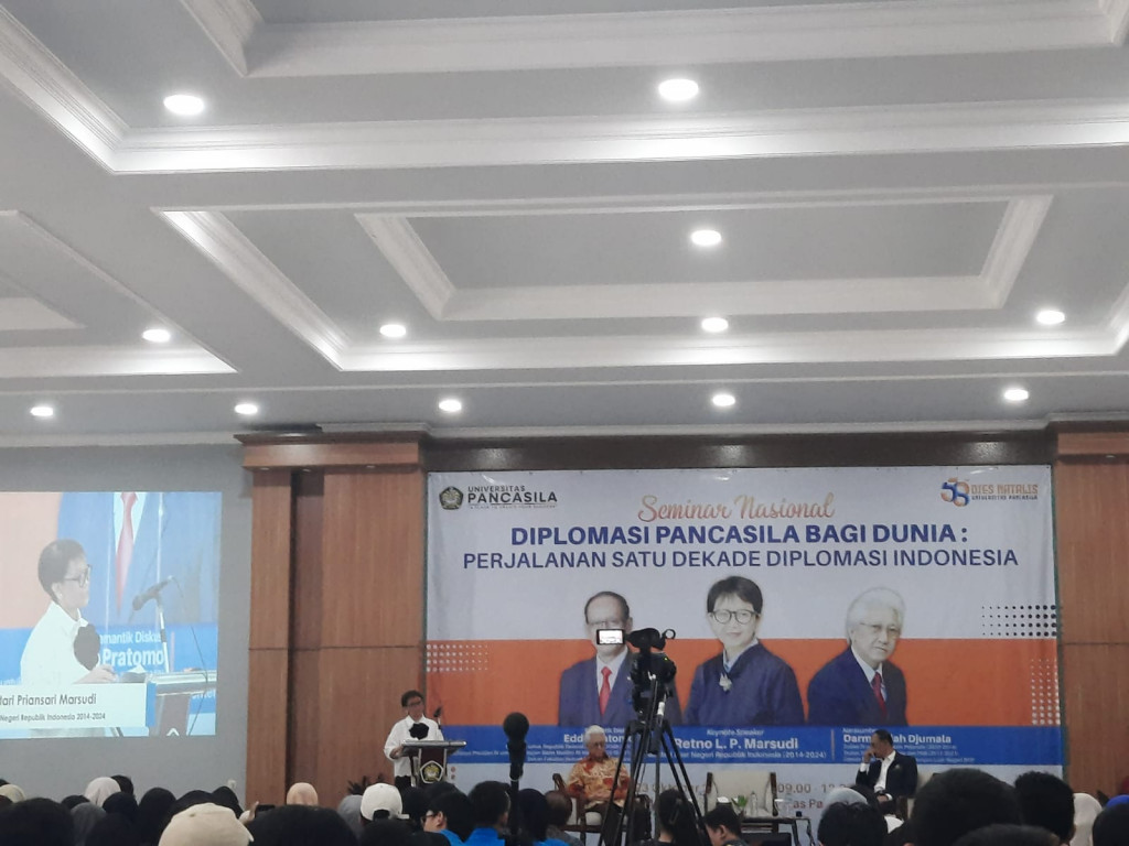 Ia berharap mahasiswa sebagai generasi muda berpegang pada prinsip Pancasila sebagai kompas berbangsa dan bernegara. Retno juga menjelaskan tantangan yang dihadapi Indonesia dalam menjaga martabat di tengah praktik transaksional global, serta pentingnya mendefinisikan kepentingan nasional.