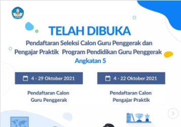 Pendaftaran Guru Penggerak dibuka pada 166 kabupaten/kota yang menjadi sasaran PGP Angkatan 5. Pendaftaran calon Guru Penggerak dibuka mulai 4-29 Oktober 2021.