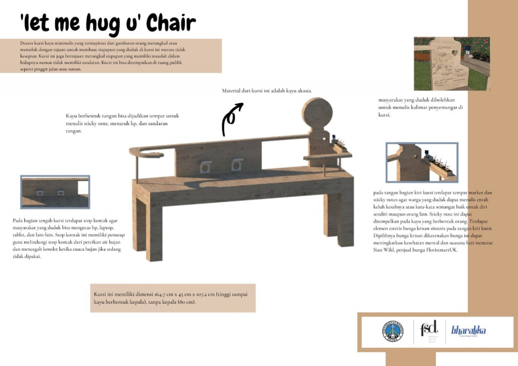 Dalam cabang Chair Design, mahasiswa ITS bernama Sarah Salasa Salsabila menyabet medali emas dengan membawakan desain kursi unik bernama “Let Me Hug U”. Sesuai namanya, kursi ini memang berbentuk layaknya orang yang sedang merangkul penggunanya.