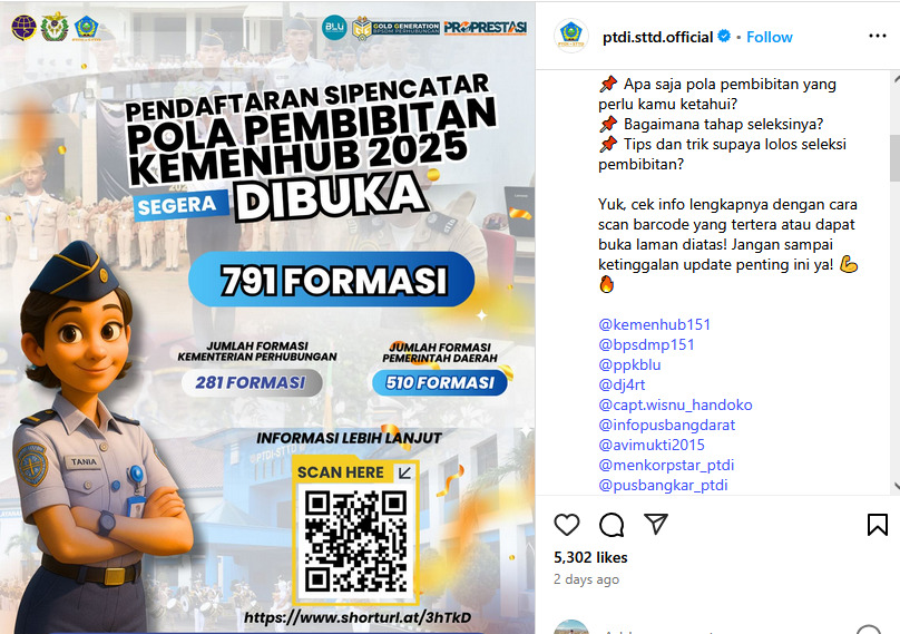 Pada 2025, Polbit membuka 791 formasi. Rinciannya, 281 formasi di Kemenhub dan 510 formasi di Pemda.