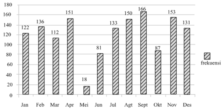 Diagram batang berikut menunjukkan produksi pakaian yang dikelola Bu Rahmi selama tahun 2020 dari bulan Januari sampai bulan Desember.