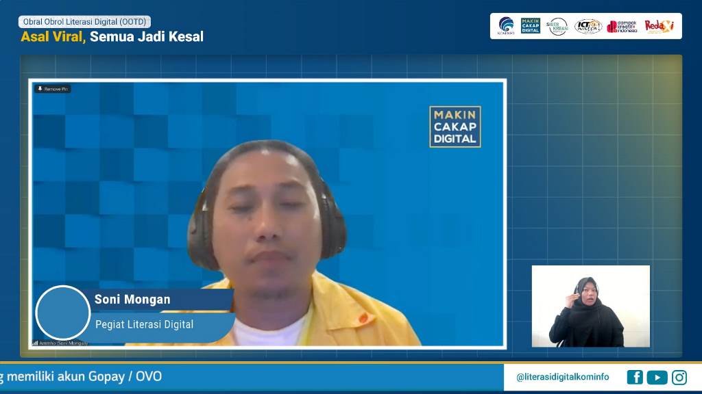 Soni mengingatkan hal itu saat menjadi pembicara dalam webinar Obral Obrol Literasi Digital (OOTD) bertajuk Asal Viral, Semua Jadi Kesal, kemarin. Webinar digagas Kementerian Komunikasi dan Informasi (Kominfo).