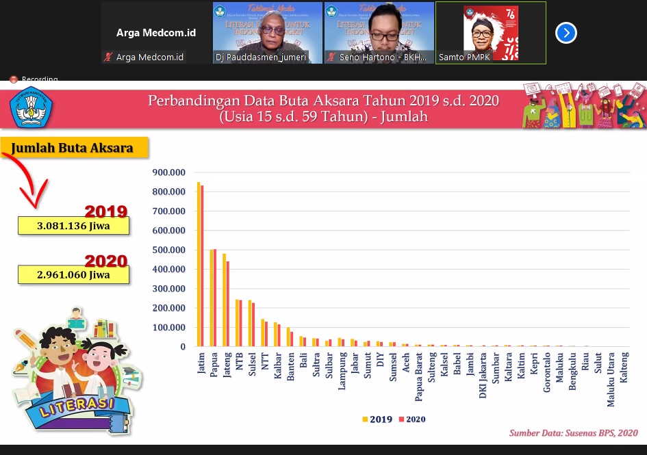 Dirjen Pendidikan Anak Usia Dini, Pendidikan Dasar dan Menengah (PAUD Dikdasmen) Jumeri mengungkapkan, pada 2019 sebanyak 3.081.136 jiwa masih buta aksara. Angka itu menurun pada 2020 menjadi sebesar 2.961.060 jiwa yang tak bisa baca tulis.