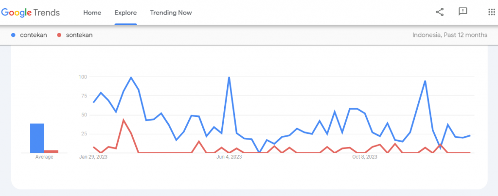 Google Trends mencatat, kata contekan lebih populer daripada kata sontekan dalam setahun terakhir. Grafisnya bisa dilihat di sini: