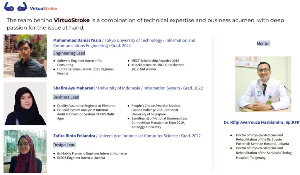 “Karena enggak dilatih, jadi kalau enggak ada latihannya, itu enggak membaik dan meninggal gara-gara itu. Coba dulu ada latihannya, yang murah, mudah, dan enggak harus ke rumah sakit, mungkin cerita nenek akan berbeda. Tapi, dari sini juga saya dan teman-teman mencoba memberi solusi, menghadirkan VirtuoStroke yang biaya pengobatannya tidak mahal, aksebilitasnya tinggi, dan mampu memotivasi pasien,” papar dia.
