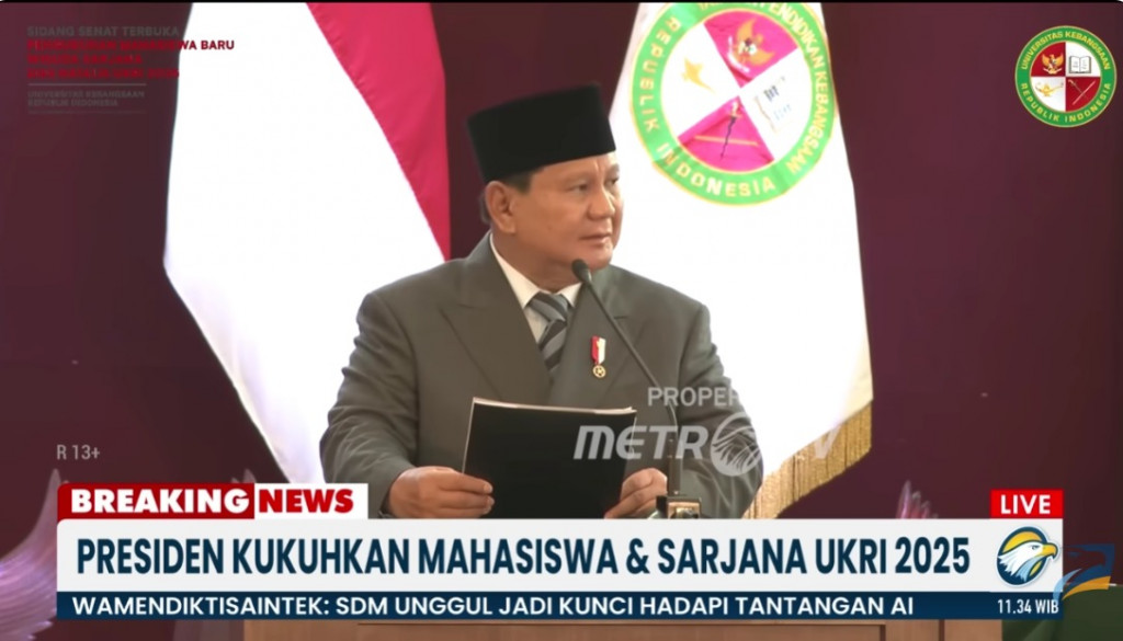 Prabowo yang juga Ketua Yayasan Pendidikan Kebangsaan Republik Indonesia menyampaikan pesan mendalam kepada para wisudawan dan mahasiswa baru. “Saudara-saudara, perjalanan perjuangan hidupmu baru dimulai. Hidup penuh tantangan dan kesulitan, tetapi juga penuh peluang bagi mereka yang berani menghadapi kenyataan,” seru Prabowo