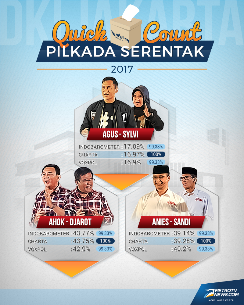 Berdasarkan hasil hitung cepat berbagai lembaga survei, tiga pasangan calon gubernur dan calon wakil gubernur DKI tidak ada yang mendapatkan suara lebih dari 50%. Dua pasangan yang memperoleh dukungan paling banyak, yakni Basuki-Djarot dan Anies-Sandi harus bertarung di putaran kedua Pilkada DKI.