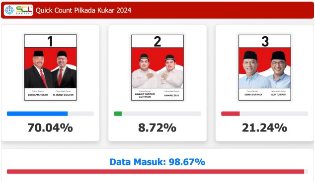 quick count yang dilakukan Lembaga Survei SCL Taktika mencatat pasangan petahana Edi Damansyah dan Rendi Solihin (Edi-Rendi) meraih persentase paling besar. Pasangan Edi-Rendi meraih 70% suara di Pemilihan Kepala Daerah (Pilkada) Kutai Kartanegara (Kukar).