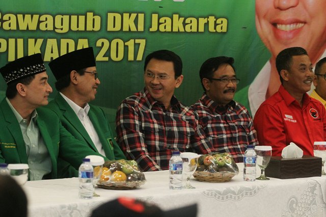 Bakal Cagub DKI Jakarta Basuki Tjahaja Purnama (tengah) bersama Cawagub DKI Jakarta Djarot Saiful Hidayat (kedua kanan), Ketua Umum PPP hasil muktamar Jakarta Djan Faridz (kedua kiri), Sekjen PPP Dimyati Natakusuma (kiri) dan Ketua Timses Ahok-Djarot, Prasetio Edi Marsudi (kanan) saat menghadiri Deklarasi Mendukung Pasangan Ahok-Djarot di Kantor DPP PPP, Jakarta, Senin (17/10/2016). Foto: MI/Arya Manggala