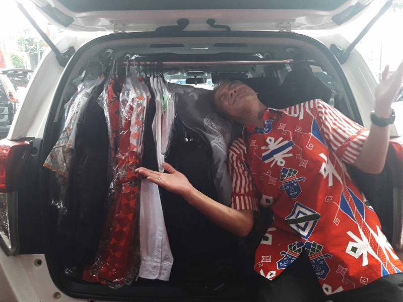 "Ini mobil dulu saya beli dengan permintaan khusus. Tempat duduk yang nyaman, dan dilengkapi centelan baju," ucapnya sambil tertawa.