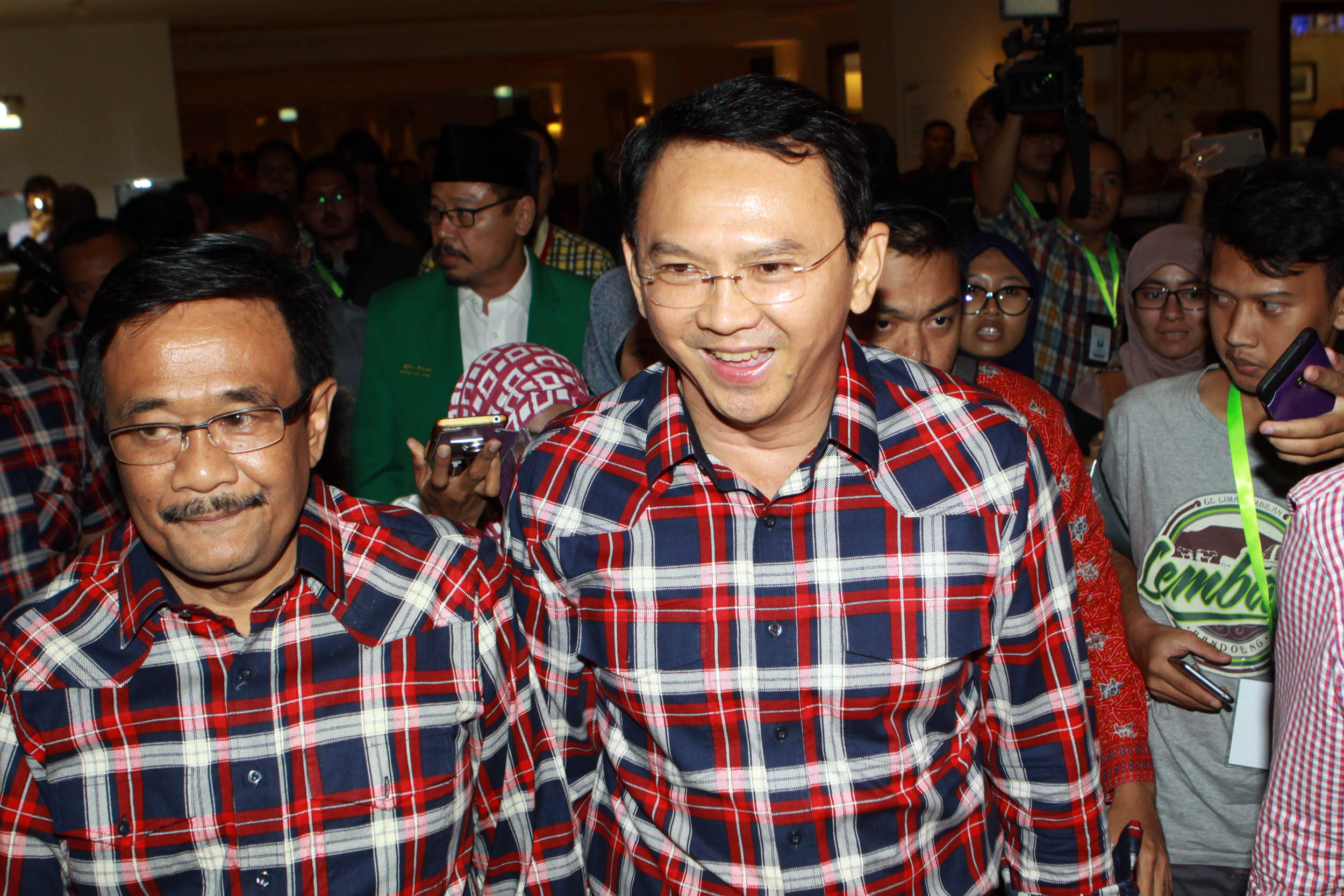 Pasangan petahana Ahok dan Djarot meninggalkan acara penetapan paslon putaran kedua Pilkada DKI Jakarta. MI/Galih Pradipta.