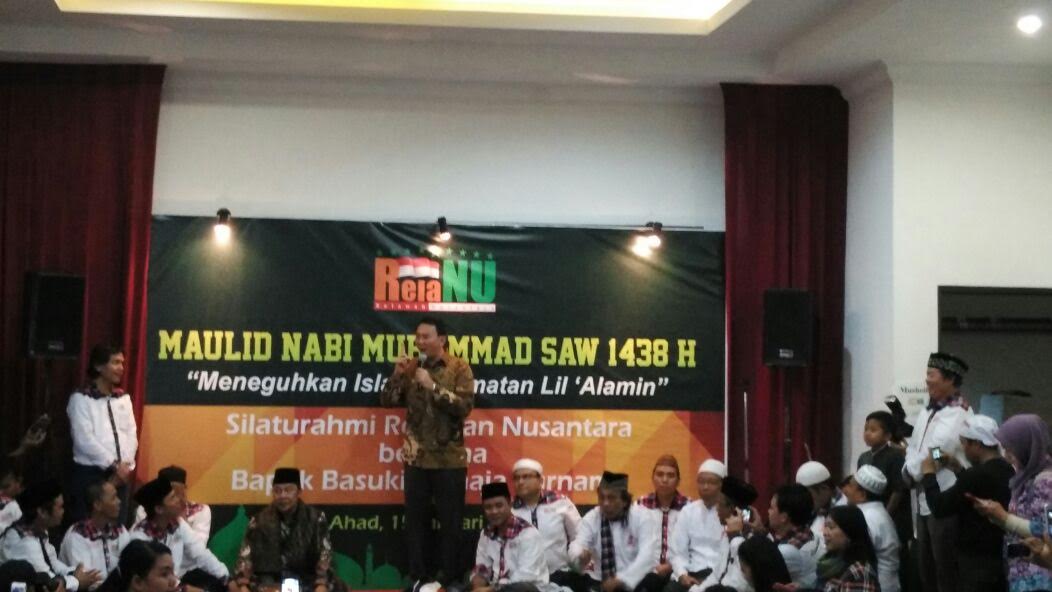 medcom.id, Jakarta: Basuki Tjahaja Purnama menghadiri peringatan Maulid Nabi di kawasan Patra Kuningan, Jakarta Selatan. Acara tersebut diselenggarakan oleh RelaNU (Relawan Nusantara).