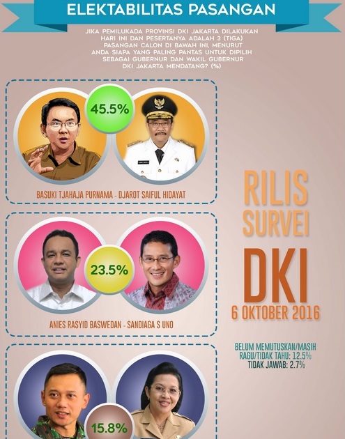 Sedangkan Ahok dan Djarot selama ini cenderung cuek dengan hasil survei. Keduanya lebih fokus menyelesaikan tugas sebagai Gubernur dan Wakil Gubernur DKI Jakarta.