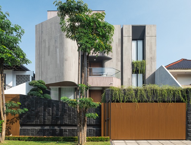 Rumah ini juga menampilkan tren terbaru dalam arsitektur kontemporer, yaitu massa bangunan asimetris. Bentuk asimetris tidak hanya diterapkan pada fasad, tetapi juga dibawa ke dalam interior untuk menciptakan kesinambungan visual yang menarik.