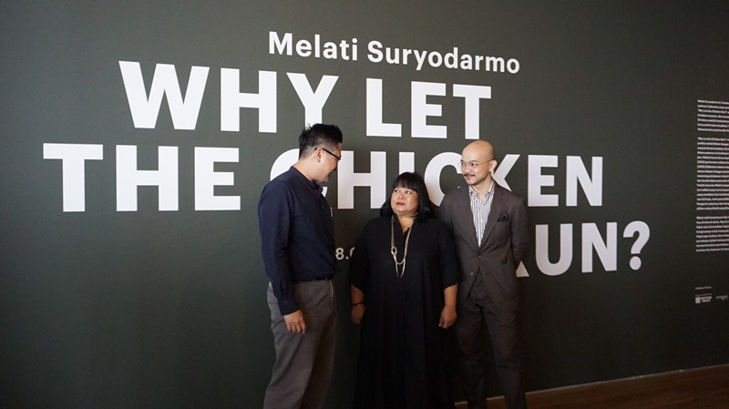 Pameran bertajuk: Why Let the Chicken Run? tersebut akan berlangsung dari 28 Februari sampai 31 Mei 2020. Warna latar yang digunakan seperti putih, abu-abu, hitam, dan dua warna lainnya.