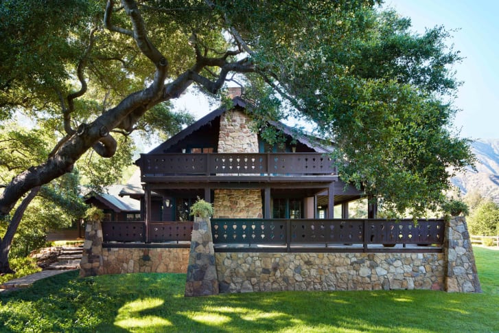 Menyerupai pondok berburu, rumah tersebut menampilkan dinding batu gurun bergaya perintis, perabotan Italia abad pertengahan yang dirancang desainer Carlo di Carli, dan perlengkapan pencahayaan kontemporer dari Michael Anastassiades.
