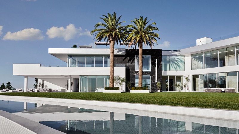 Rumah ini dilengkapi 42 kamar mandi, 21 kamar tidur, garasi yang menampung 30 mobil dengan dua turntable, arena bowling empat jalur, spa, bioskop dengan 30 kursi, dek seluas 929 meter persegi, dan lima kolam renang.