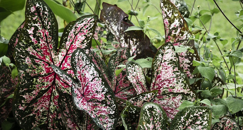 Daunnya hijau indah dengan totol putih, namun getahnya mengandung kalsium oksalat yang bisa menyebabkan pembengkakan pada lidah dan tenggorokan bila terkena mulut. Anak-anak dan hewan peliharaan sangat rentan terhadap efeknya.2. Caladium (Keladi)