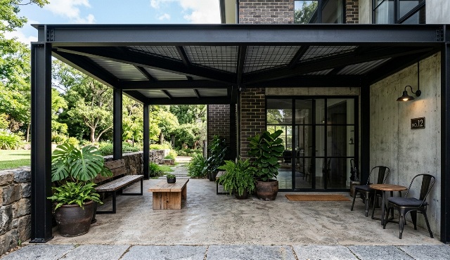 Kanopi ini menggunakan rangka berwarna hitam doff yang menciptakan kesan maskulin dan modern. Gaya ini cocok dipadukan dengan lantai teras berbahan beton ekspos atau batu granit bertekstur kasar. Kombinasi tersebut menghasilkan tampilan eksterior yang tegas, trendi, dan tahan lama.