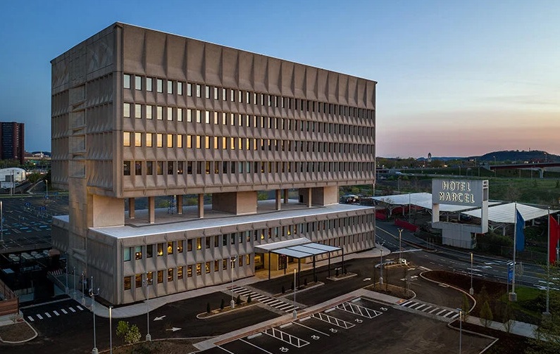 Sebuah bangunan bergaya arsitektur brutalis berdiri kokoh di kota New Haven, Connecticut. Bangunan yang dirancang oleh arsitek Marcel Breuer pada 1967 tersebut sebelumnya merupakan gedung perkantoran Amstrong Rubber Co.Pada tahun 2019, Bruce Becker dari studio arsitektur Becker & Becker mengakuisisi landmark bersejarah dari IKEA dan menghabiskan tiga tahun untuk mengubahnya menjadi hotel.