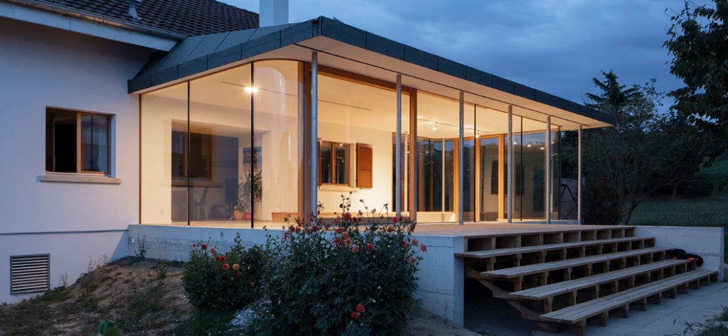 Lempengan beton dijadikan sebagai konstruksi dasar di bagian lantai, kemudian ditutupi kayu. Sementara, kaca difungsikan sebagai fasad bangunan tambahan. Beberapa bagian, terutama di sudut bangunan dipasangi kaca melengkung.