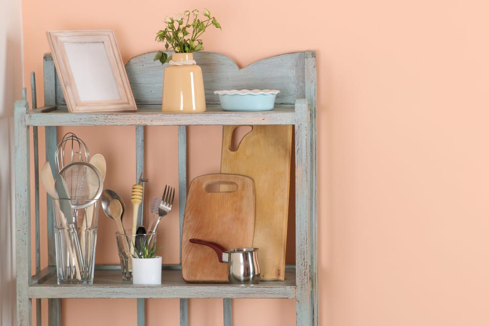 Warna peach dan cream memberikan kesan hangat sekaligus lembut. Kedua warna ini mampu membuat dapur terasa lebih ramah dan nyaman, cocok untuk hunian bergaya minimalis maupun skandinavia.