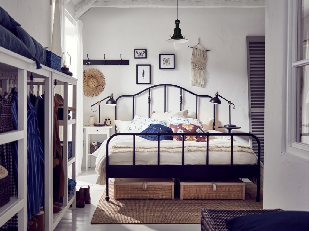 Buat platform tempat tidur kayu dengan rak terbuka. Kemudian simpan aksesori di keranjang kawat, diselingi dengan tanaman buatan pot untuk tampilan dekoratif.