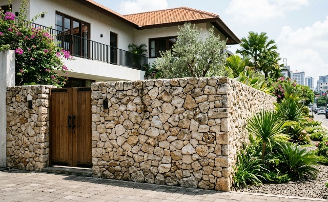 Pagar berbahan batu alam menawarkan daya tahan terhadap berbagai kondisi cuaca, sekaligus menghadirkan nuansa natural yang memberikan kesan sejuk, hangat, dan elegan. Keindahan material ini berasal dari warna dan tekstur asli batu yang sulit ditiru material buatan.