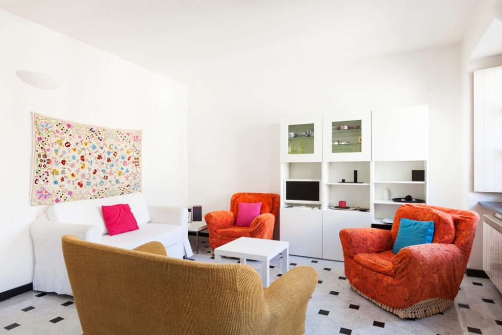Ruang tamu tak selalu harus dilengkapi sofa. Jika ruangan sempit, arm chair side chair bisa menjadi alternatif pilihan. Untuk menambah fleksibilitas, tambahkan ottoman yang bisa disulap menjadi tempat duduk dengan tambahan pouf.