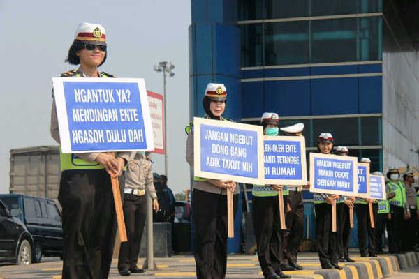 medcom.id, Jakarta: Polisi melakukan berbagai upaya untuk menekan angka kecelakaan pada musim mudik Lebaran tahun ini. Selain menilang para pelanggar lalu lintas, polisi menggugah kesadaran pengendara dengan cara-cara kreatif.