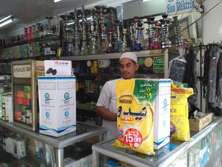 "Kami jual kismis, teh Arab, beras Arab, kurma, air zam-zam, dan halwa," ujar Hasan.