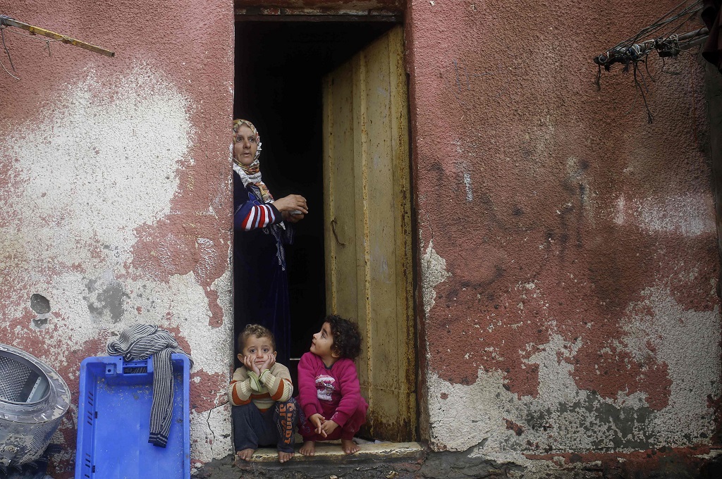 Seorang wanita dan dua anaknya beraktivitas di rumah mereka di Jalur Gaza, 15 Januari 2018. (Foto: AFP/MOHAMMED ABED)