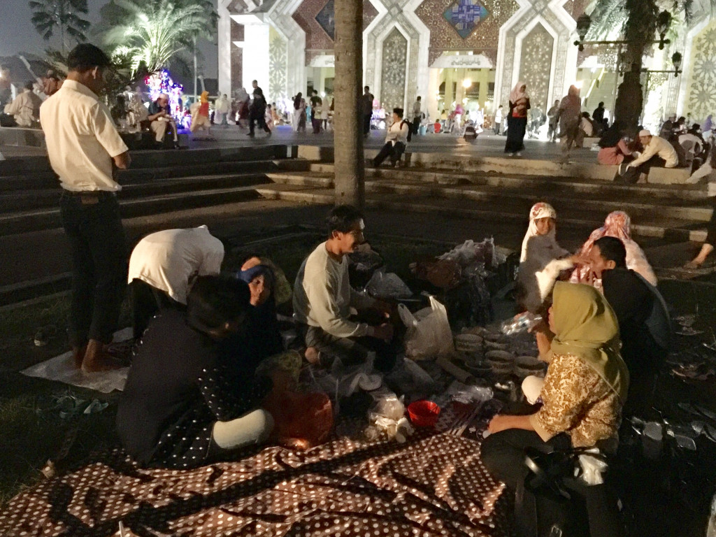 Contohnya Edi dan Sugi yang berada di pelataran masjid dengan 12 orang keluarganya. Edi dan Sugi menggelar tikar di pelataran masjid. Makanan yang dibawa dari rumah pun dikeluarkan satu per satu, mulai dari lontong hingga kolak.