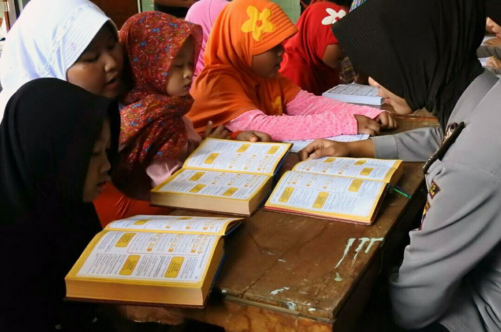 Anak-anak nampak bersemangat belajar membaca Alquran. Para polwan pun dengan sabar mengarahkan jika ada kesalahan bacaan.