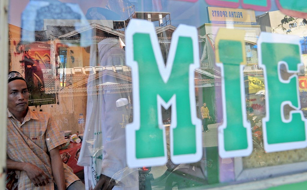 Seorang anggota Front Pembela Islam (FPI) meminta kepada pemilik warung mie untuk menutup dagangannya di pusat pertokoan Panakkukang Makassar, Sulsel. (ANTARA/Sahrul Manda)