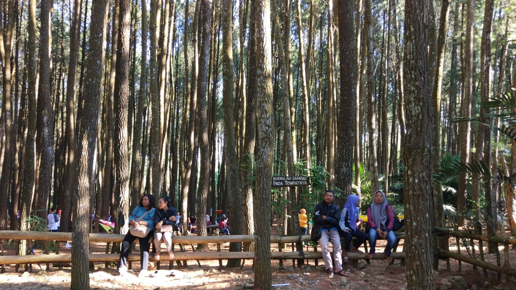 Pohon pinus menjulang dan tersusun rapi. Ratusan hingga ribuan pelancong terlihat bercengkerama dengan orang dekatnya di bawah pohon rindang nan asri.