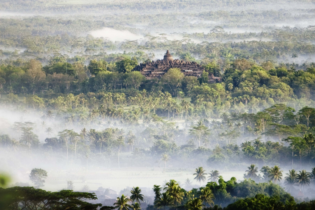 Borobudur yang berselimut kabut terlihat dari bukit Puntuk Setumbu, Magelang, Jawa Tengah. Beberapa waktu lalu. Candi ini adalah salah satu yang terbesar di dunia dan terpenting bagi umat Budha. MI/SUMARYANTO