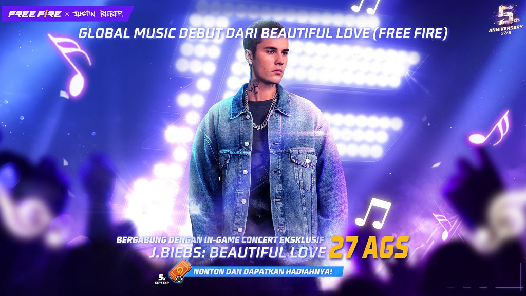 Tidak hanya karakter, Justin Bieber juga berkolaborasi merancang sejumlah hadiah in-game seperti mobil sport eksklusif, groove emote, dan masih banyak lagi. Di konser virtual, Justin Bieber juga akan menyanyikan debut lagu terbaru berjudul “Beautiful Love (Free Fire)”.