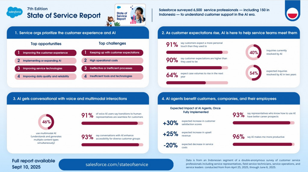 Laporan global dari survei 7th State of Service terhadap 6.500 profesional jasa—termasuk 150 responden di Indonesia—mengungkapkan bahwa pada tahun 2027, AI diperkirakan akan menangani 55% dari seluruh kasus layanan pelanggan di Tanah Air, meningkat dari hanya 40% pada saat ini.