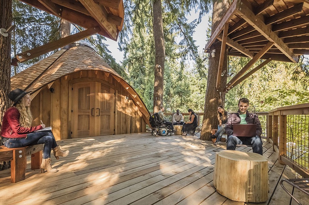 Jadi, rumah pohon ini tetap menyediakan fasilitas selayaknya workspace di dalam gedung, namun dengan desain interior dan suasan yang lebih santai tetapi membantu pegawainya fokus.