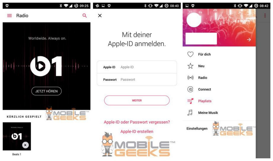 Seperti dilaporkan The Verge, beberapa screenshot Apple Music untuk Android yang ditangkap Mobile Geeks telah beredar di internet. Berdasarkan screenshot tersebut, pengguna Android akan dapat membuka menu dari Apple Music dengan menekan ikon hamburger (ikon tiga garis).