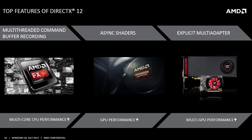 Sementara itu, dalam DirectX 12, AMD akan mengimplementasikan Explicit Multi-GPU. Pengguna bisa menggunakan dua kartu grafis sekaligus, tanpa terikat dengan teknologi CrossFireX. Pengguna dapat menduetkan kartu grafis onboard pada prosesor AMD APU dengan VGA terpisah Radeon, terlepas dari seri apapun.