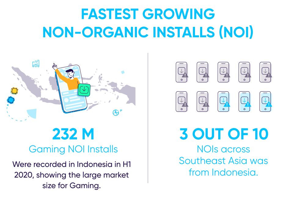Data yang diolah AppsFlyer mengindikasikan bahwa Indonesia memiliki angka pertumbuhan non-organic installs (NOIs) tercepat di antara enam negara yang diobservasi (Indonesia, Malaysia, Filipina, Singapura, Thailand dan Vietnam).