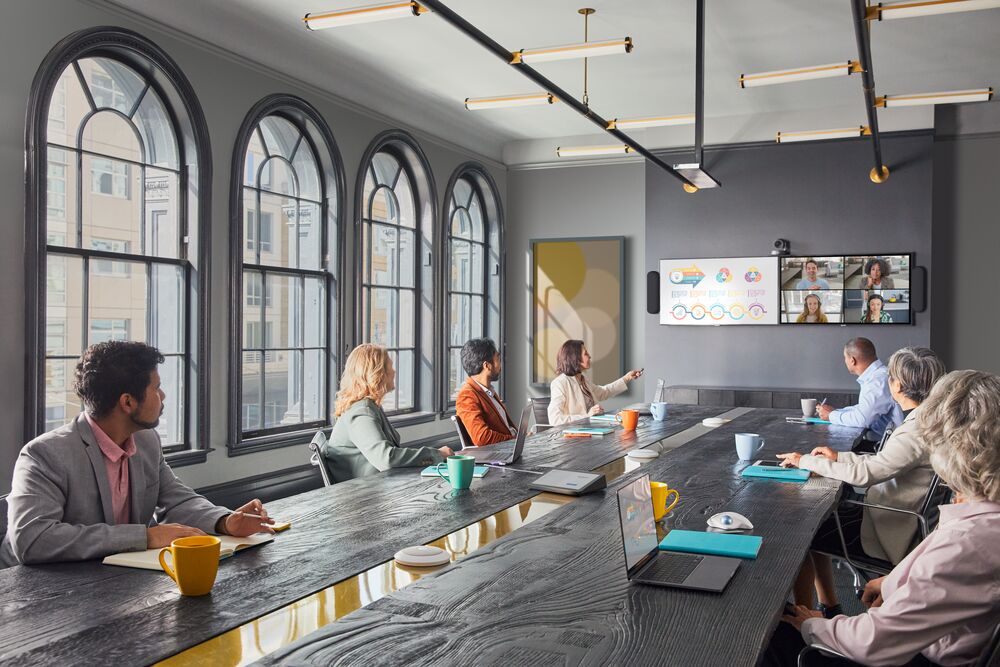 Ukuran sebuah ruangan meeting tidak seharusnya membatasi kolaborasi dalam ruang kerja hybrid dan perusahaan perlu memastikan agar seluruh peserta baik yang berada di kantor maupun di tempat lain dapat melihat-dilihat dan mendengar-didengar secara setara, sehingga seluruh peserta mempunyai dampak yang sama di dalam ruang meeting tersebut.
