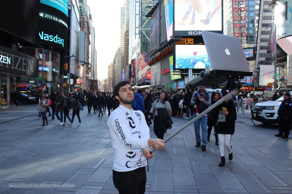 Satu-satunya keunikan dari tongsis ini adalah bukan smartphone yang Anda pasangkan di bagian ujungnya, tapi sebuah MacBook.