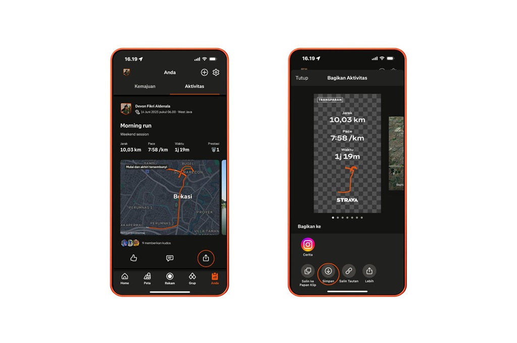 Setelahnya, pengguna dapat memanfaatkan aplikasi edit video kesukaan dan menambahkan overlay statistik aktivitas Strava yang telah diunduh di konten video. Setelah selesai, pengguna bisa langsung membagikan konten ke berbagai platform media sosial, dari Instagram, TikTok, hingga Threads.