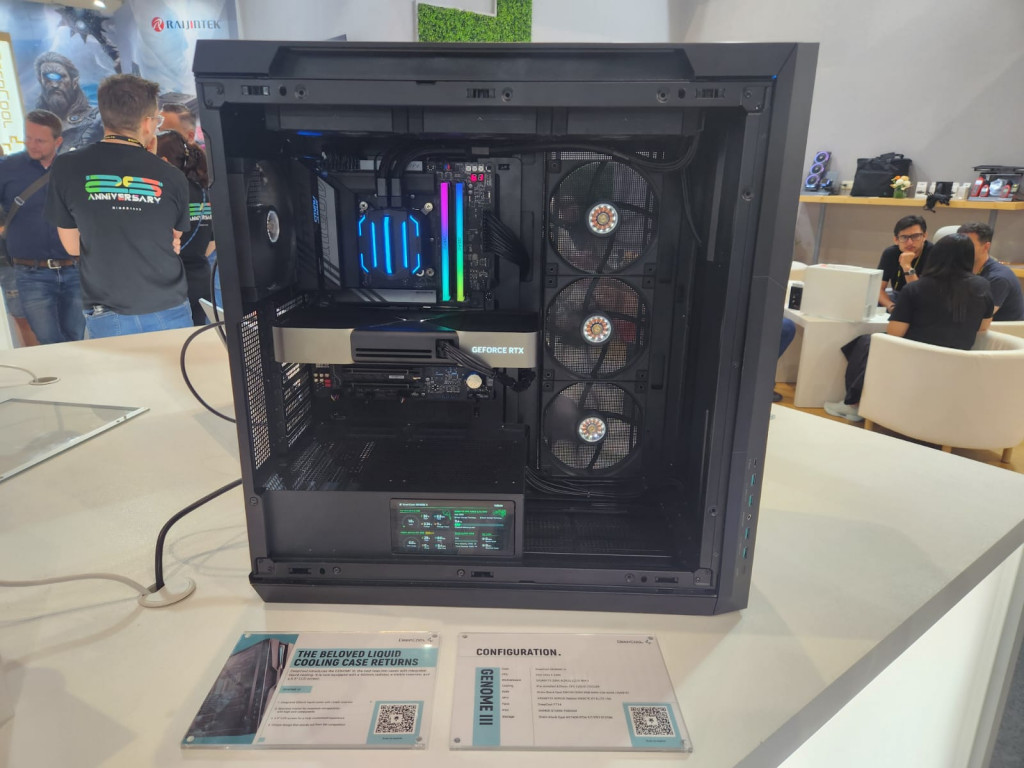 Salah satu casing ini adalah Genome III, sebuah casing PC dengan pendingin cair terintegrasi. Genome III hadir dengan radiator 420mm, reservoir yang terlihat, dan layar LCD 5.5 inci yang dapat disesuaikan.