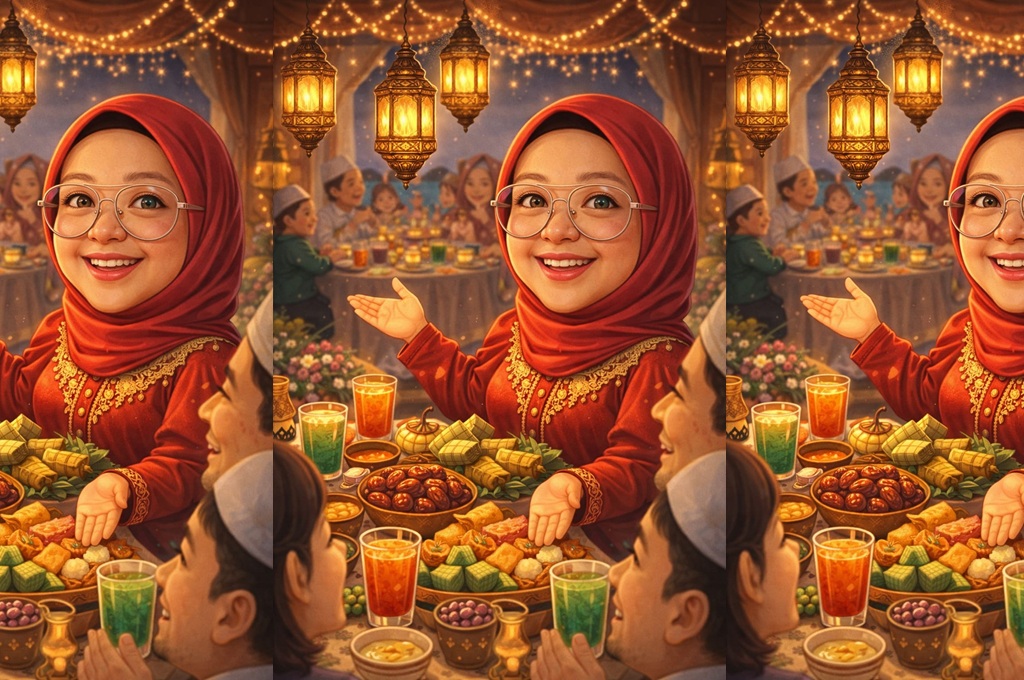 “Ubah saya menjadi karikatur Ramadan sebagai tuan rumah buka puasa terbaik. Pakaian: meriah namun tetap sederhana. Perlengkapan: meja yang ditata indah dengan kurma, takjil, ketupat, dan minuman. Sertakan lampu gantung hias yang hangat dan suasana kebersamaan keluarga/komunitas. Ekspresi: ramah dan gembira.”