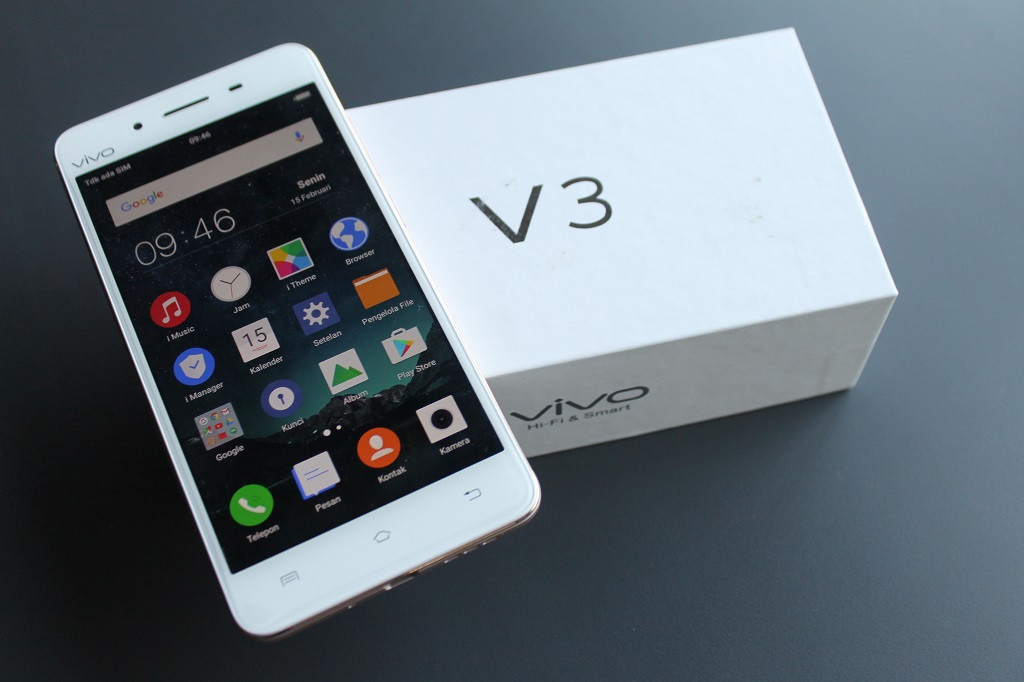 Vivo V3 memiliki kotak persegi panjang berwarna putih dengan tulisan "V3" di bagian depan tengahnya. Di bagian samping, tertulis merek Vivo dan "Hi-Fi and Smart".