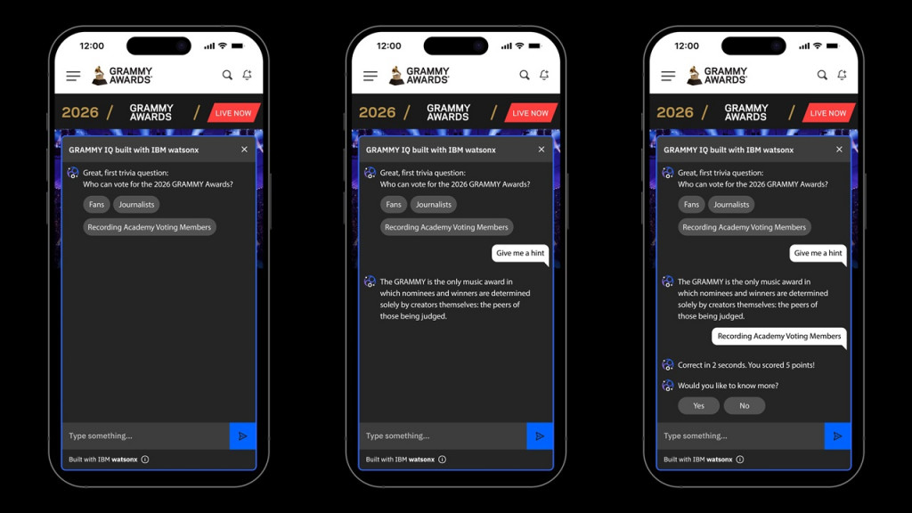 Grammy IQ yang dibangun dengan watsonx menghadirkan asisten AI yang terintegrasi di berbagai kanal digital Grammys, memungkinkan penggemar berinteraksi dengan mudah dan mulus. Solusi ini dirancang untuk mendorong keterlibatan harian dan aktivitas berbagi di media sosial dengan fitur papan peringkat dan undian berhadiah.